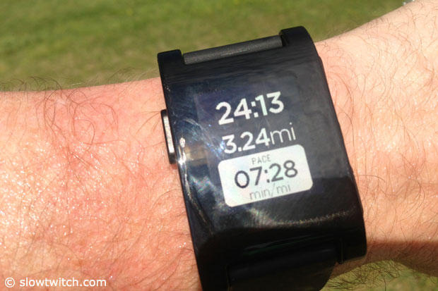 When paired with the Runkeeper app you can see time, distance and either pace or speed. You can pause and resume with the watch, but you need to start the activity on the phone.