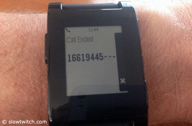 Phone calls show up on your Pebble too and that allows you to decide quickly if it is worth to pull your phone out of the pocket. In this case I took the Dan Empfield call. (we blurred out the number since so many asked)