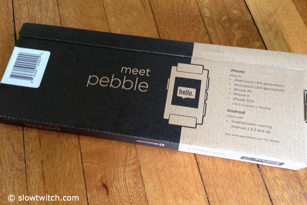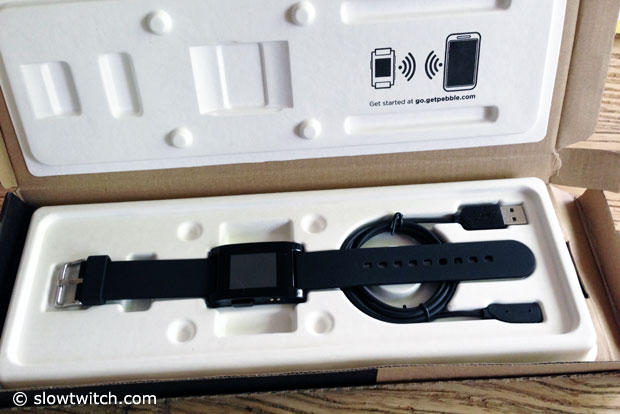 The watch and the US charging cable were all that was in the box, all instructions came via the Pebble app on the iPhone.