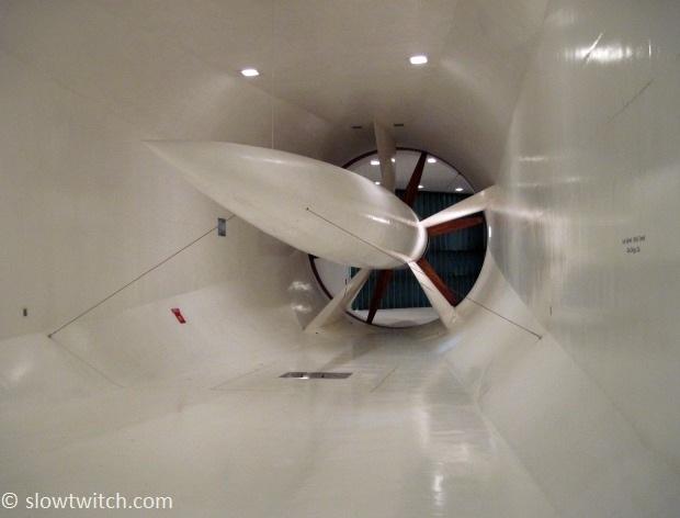 It’s an “open” design, that is, open circuit or open return. It’s not shaped like a big oblong donut. This kind of tunnel is linear, inside a vaulted warehouse, and the air enters and exits each end. These are generally considered cheaper to build than closed circuit tunnels but they are not necessarily less accurate. A lot of attention must be paid to smoothing and conditioning the air prior to entering the test section.