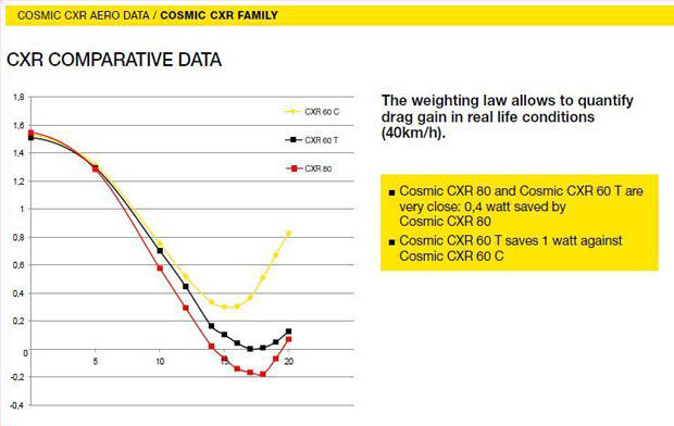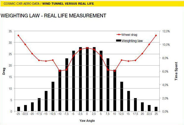 Additionally, as with the CXR80 introduction, they also discussed the data they took with their own wind angle device during outside riding and the resulting average percent time at yaw angle plot. They used this data to create a weighted averaging approach for the wheel data to more realistically compare power differences between wheel designs. The weighted average actually values low yaw angle performance to a greater degree, but the Mavic wheel designs tend to perform much better than their competition at higher yaw angles, where they don't stall as early, nor as dramatically. Even so, according to the weighted average, the Mavic wheels still come out ahead aerodynamically. Additionally, because the data used to form the weighted average was from a large number of rides and riders, that means that it's possible that the same plot for a slower than average rider might be flatter and thus more highly value the higher yaw angles. That would again favor the Mavic wheels.