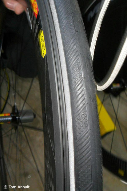 With their emphasis on the tire-leading portion of the system, it was imperative that Mavic was able to design and implement under their own control a tire which would present the proper parabolic profile on the leading edge of the wheel. This has resulted in the development of their CXR Yksion tubular tires (GripLink front and PowerLink rear) last year, and with the introduction of the CXR60 clincher version, the new CXR Yksion clincher tires. Being made from a flexible material and inflated with air pressure, it's difficult to control the precise external shape of a tire. You can get close, but in the end there are always variances. So, Mavic relies on an old trick of the aerodynamics trade. On the sidewalls of the tire is molded a specific pattern which to the uninitiated may look like traction grooves. In fact, Mavic sponsored triathlete Frederik Van Lierde commented that when he was first sent the CXR tires last year, he thought that they were rain tires due to the patterning. He didn't realize that the pattern is actually an aerodynamic device known as a "boundary layer trip."