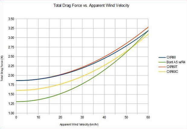 Shown below is a plot of the CXR60 wheel performance if the rolling resistance is included. To create that plot, I used Mavic's own weighting law and aero drag data and combined it with rolling resistance measurements, see blog post here for more detail: http://bikeblather.blogspot.com/2013/04/why-tire-crr-matters.html. For the new CXR Yksion tires, I used an assumed Crr value based on the measurements of the tubular version, with the differences noted by Mavic subtracted out (real world values, not smooth surface). As you can see, the CXR80 and CXR60T have nearly identical performance, mostly due to the use of the same tires, but also due in part to the very close aerodynamic performance, with the CXR80 pulling slightly ahead at higher expected apparent wind velocities. The interesting thing is that even with just the Crr difference quoted by Mavic for the new clincher tires (adjusted by a factor of 1.5x to represent the performance on real world road roughness) the CXR60C handily beats the other wheels in the CXR line over the entire range of apparent wind speeds shown. Also included in that plot is a curve showing the expected overall aero+rolling resistance performance of the Bontrager D3 Aeolus 5 clincher wheel with Bontrager's R4 Aero tire. For the rolling resistance of the R4 Aero, I used the value I measured in roller testing with a latex tube installed. Despite the Mavic wheels' better aero performance, the lower rolling resistance of the Bontrager setup allows it to handily beat the Mavic wheels, and it only begins to be beaten by the CXR60C at apparent wind speeds greater than 55 kph, which is a VERY high wind speed. Of course, it's also possible that putting a latex tube inside the Yksion tires could drop their Crr to be close to that of the R4 Aero, at which time the advantage would go to the CXR60C due to it's better aero performance, as represented by the shallower slope of its combined aero+Crr drag curve. This potential outstanding performance for the CXR60C also points to the fact that a clincher version of the CXR80 would also be a stellar performer. When asked about if that was in the plans, the Mavic folks were a bit coy on the subject and said that they want to concentrate on the CXR60s this year, but that a CXR80C might be an option in the future.