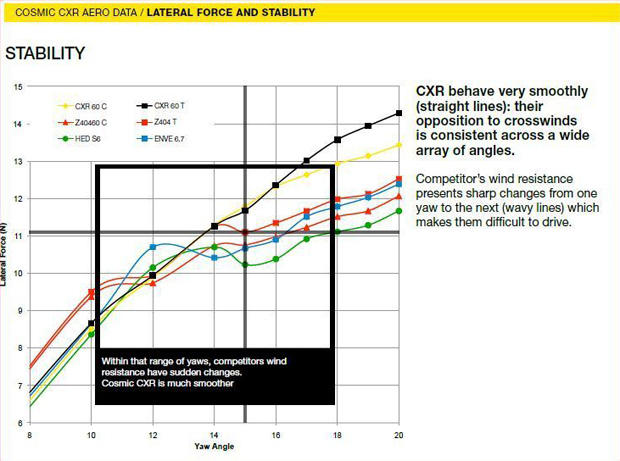 Another set of data that they presented was the total side force on the wheels. This is the force acting perpendicular to the direction of travel. In general, the deeper the wheel, the more side force that is generated in a cross wind due to the increased surface area. In those plots, the curves for the Mavic wheels demonstrate a nearly constant slope with respect to yaw angle, meaning that the side force changes in a smooth and linear fashion. They pointed out that the side force of some competitor wheels appears to vary around at the higher yaws, asserting that this would result in more unpredictable handling. That would be true if side force was the only thing affecting handling in this regard, but in reality it's the fact that a center of pressure of the force on a front wheel is usually close to the center of the wheel, but the steering axis is offset from the center. This means that this offset results in a steering torque about that axis. However, we know that some wheels are designed to move that center of pressure point rearward to be more closely aligned with the steering axis and thereby lessening the steering torque no matter the magnitude of the actual side force. Based on that, it's not clear how well the design of the CXR60 wheels has addressed the steering torque issue. If the center of pressure is still offset from the steering axis, then it's entirely possible that these designs would end up with more steering torque input as compared to other designs.