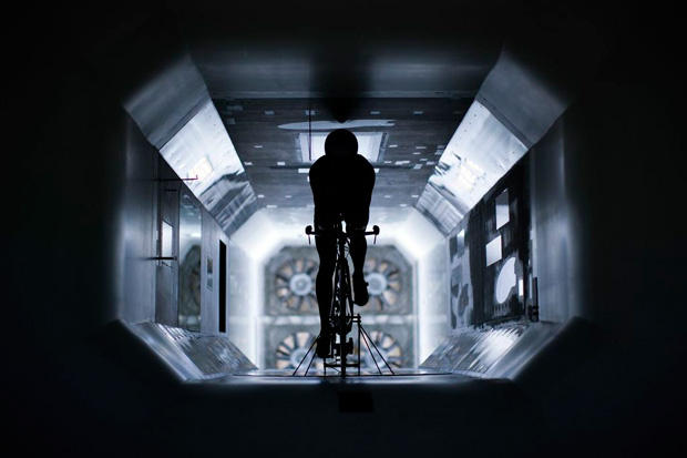 The wind tunnel design is what is known as a closed-circuit layout, in that the air flow is drawn through the central test section and then recirculated around the outside of that structure between it and the tunnel walls. This is in contrast to open circuit designs such as the A2 and the newly announced Specialized wind tunnel. Traditionally, the closed-circuit design is considered to be preferred format due to having better control of the air during the testing. There are caps at either end of the tunnel that split and guide the air flow in making the necessary 180 degree turns. In a discussion with the Director of the Facility, Dr. Flavio Noca, I asked him if because of the tapered cathedral shape of the tunnel walls there were any special tricks or features used to prevent uneven flow through the circuit. He explained that the entire setup was tested as a scale model in the university's hydrodynamics lab so that they could better visualize the flow and minimize any issues.