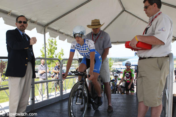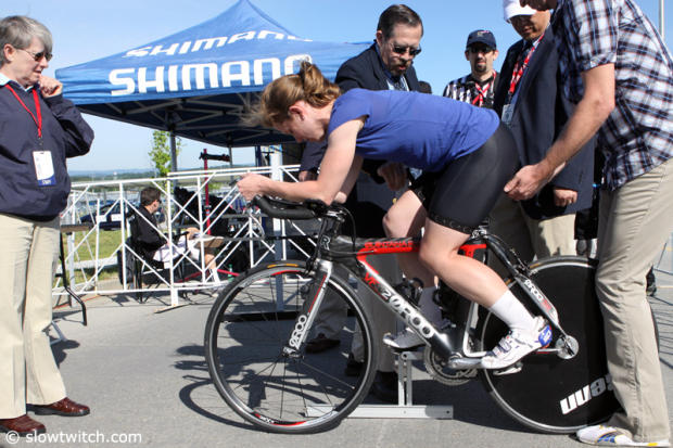 Katie Ryan at 5'3" gave the officials an issue with the UCI bike fit rules. Her saddle had to be moved way back.