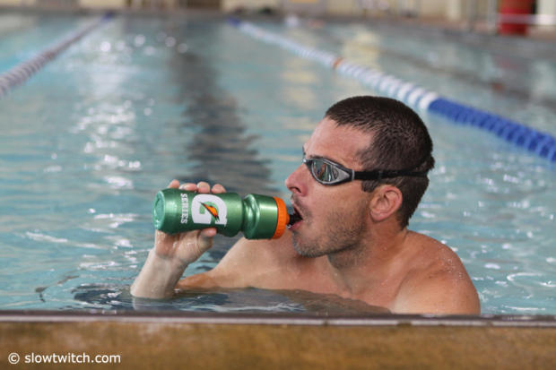 A quick refreshment during the 4,000 yard morning swim and then back to work.