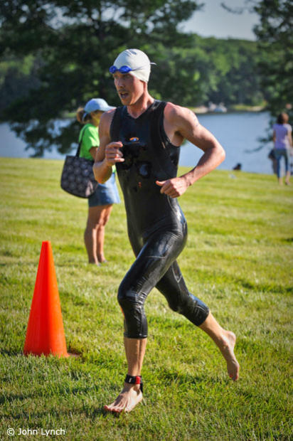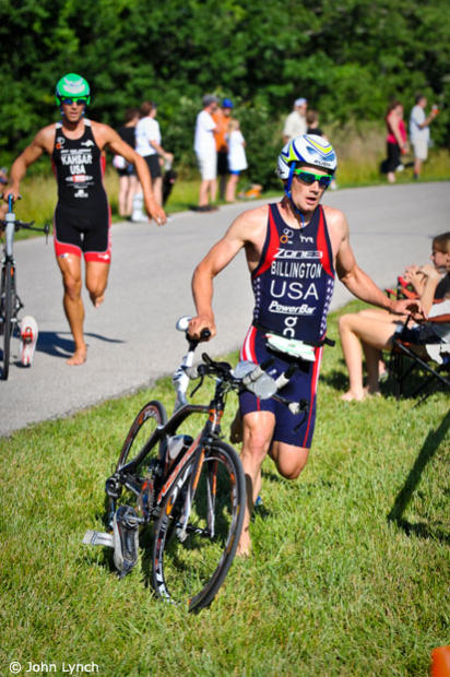 Greg Billington charges into T1 after an race leading 18:40 swim.