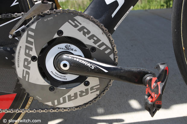 A Specialized S-Works SRM powermeter with SRAM rings and Time pedals.