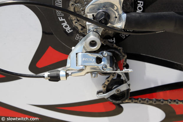 The bike is equipped with SRAM Red derailleurs and shifters.