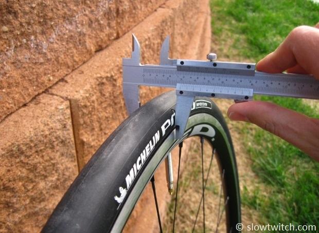 On the fat rims, these ‘25mm’ tires measured a whopping 28.0mm. I asked Michelin’s Eric Doyne to provide me with a measurement on a narrow 15c rim (a Shimano C35 clincher), and it measured 27.9mm (both were measured at 90psi).
