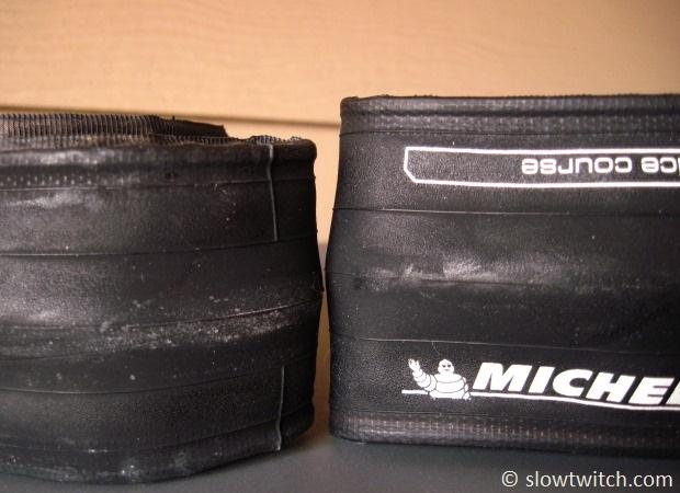 I noticed that, in addition to the width difference, the Comp is slightly more flexible in your hand – suggesting lower rolling resistance. It also has much more pronounced ridges that run radially on the inside of the tire.