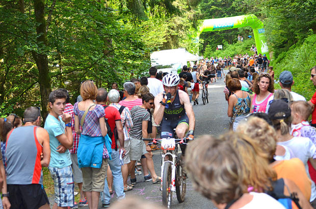 Crowds cheer on the riders on one of the more accessible hills on the Gerárdmer bike course.