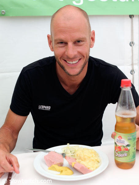 Dirk Bockel was enjoying Leberkäse and potato salad at the carbo party. A wise choice I must say. Cam Brown also tried it and he did not even know what it was. Kudos.