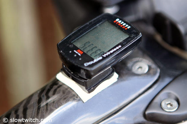 A bit of ingenuity and sticky tap allows him to mount the Cateye Strade computer on the stem.