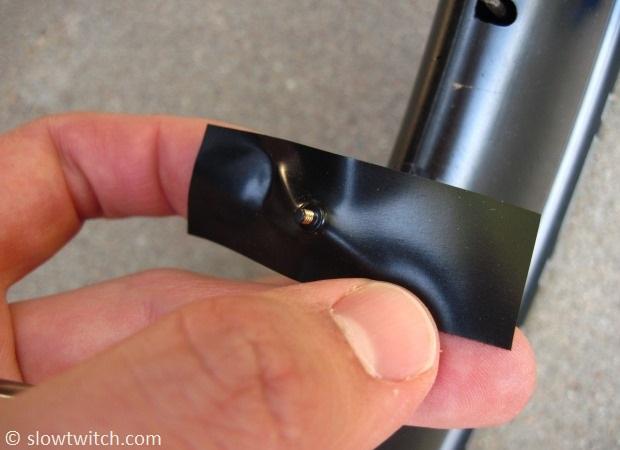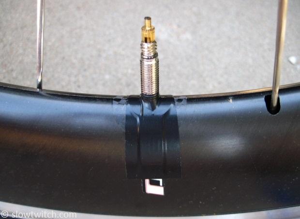 You can be super-pro and try to make the tape as smooth as possible. I must be a lousy mechanic, because my tape has a small fold just to the left of the valve (above). Or – maybe I put that there on purpose to trip the air into a boundary layer of turbulence for superior valve aerodynamics. You decide.