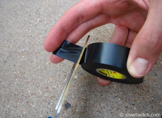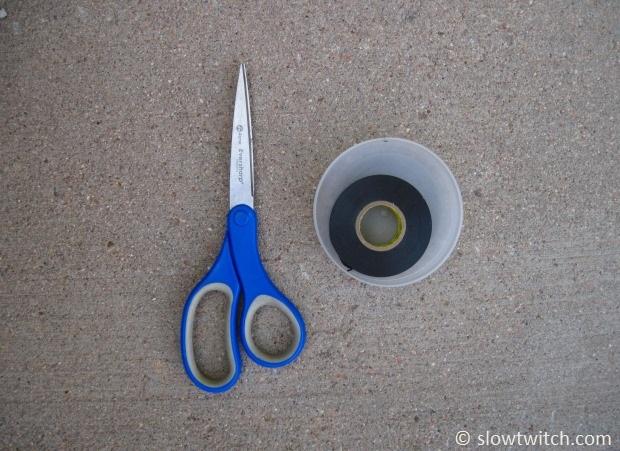 Wild stuff, huh? Electrical tape and scissors. To be precise, that’s 3M Super 33+ tape. You want to use Super 33+ for this; trust me. Don’t try to use the bargain stuff – it’s not as flexible and not as sticky.