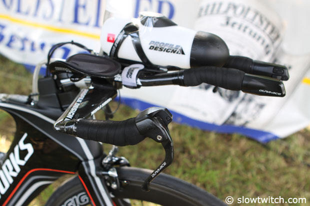 A Profile Design cockpit with Shimano Dura-Ace Di2 shiftes and brake levers.