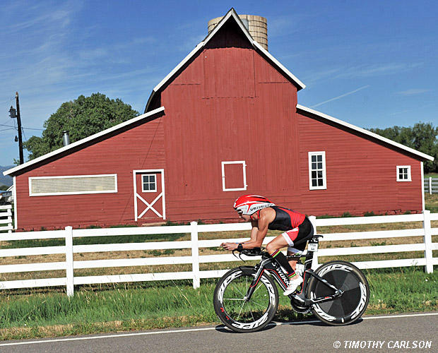 When the dust settled on Boulder’s new, one-loop 70.3 bike course and the usual twice-around-the-Reservoir run, Gambles failed to keep his vow, posting a fast 3:44:41 finish which topped by 1:42 an excellent effort by runner-up Greg Bennett and left 3rd-place finisher Callum Millward of New Zealand 3:12 in arrears. On his way to a Boulder 70.3 hat trick, Gambles’ 2nd-fastest 2:03:25 bike split was 3:04 slower that his mark last year, but his race-best 1:14:30 run was 1:47 faster than Bennett and 3:03 faster than his 2012 run. Gambles’ finish was 37 seconds slower than his 2012 time on the old two-loop bike course. Bennett was running right behind Gambles when he had to stop for a minute to work out leg cramps.