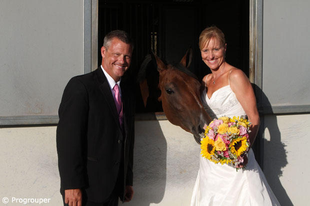 2006 Ironman World Champion Michellie Jones got married this weekend to Robin Barsantee in Escondido, CA and the equine loving Jones arrived on the back of a horse to the ceremony. The wedding was "giddy up" themed and Bob Babbitt was the master of ceremonies. Everyone in attendance seemed to have had a great time and we are very happy for the couple. Congrats Michellie and Robin.