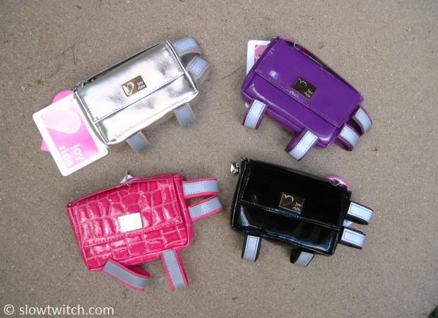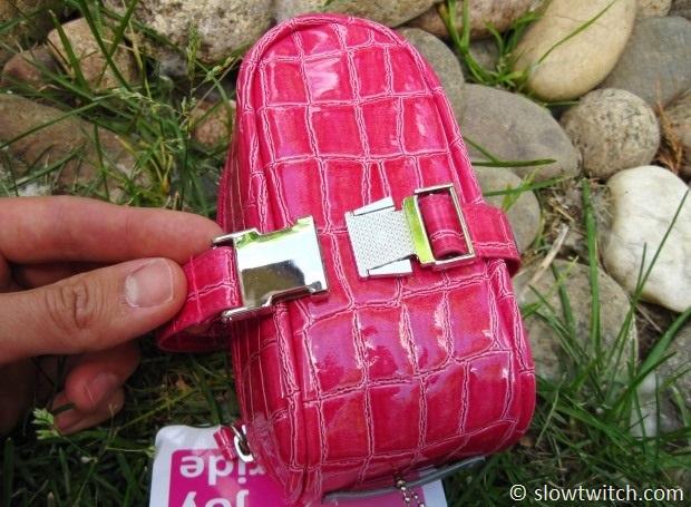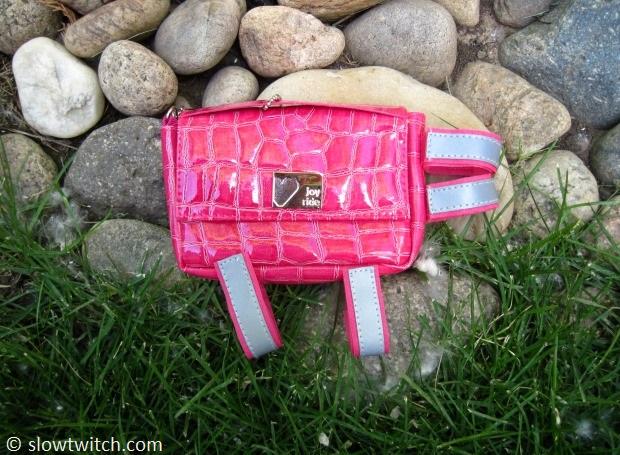 That saddle bag is from the CycleAware’s ‘Joy Ride’ line. It’s called the Saddle Up, and comes in either pink or purple. The bag measures 6" x 3.75” x 3.5" – enough to fit a spare tube, valve extender, compact Co2 inflator, tire levers, and a small multi-tool. It’s what I’d call a ‘medium’ size saddle bag – one step above the super-micro bags, but definitely not a heavy hauler.