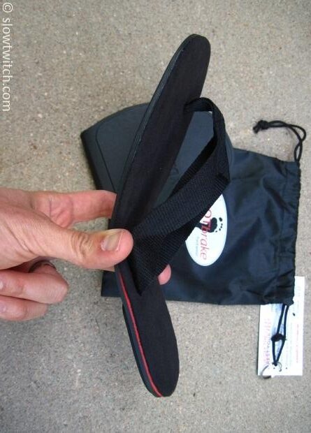 The thickness of each FOOTbrake sandal when folded is about equal to one-and-a-half modern cell phones (or about three cell phone’s worth of thickness for the two sandals put together). As a result, my only criticism of the product is just that – the size. You can fit both sandals in one jersey pocket, but you can’t use that pocket for anything else. In my mind, this makes FOOTbrake best for warm weather use, and rides that don’t feature long distances between stops – either of which require that you carry more food or clothing in your pockets. It’s a product for the social ride, not the 6-hour long ride in the middle of your Ironman training block.