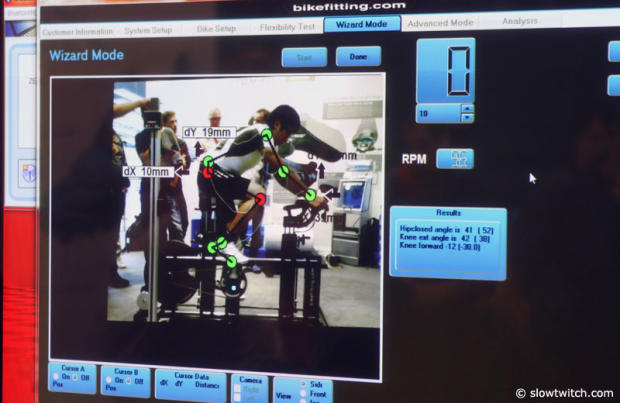 Shimano's bike fitting motion capture system has a wizard mode and the red dots show where adjustments need to be made, soon the system can also directly compare the rider's regular bike numbers with the laser pointing the other way.