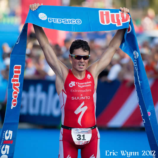Gomez, who decided that a catered speed workout with a $100,000 payday was just the thing to prepare for the ITU World Triathlon Series title showdown two weeks from now in London, combined a race-best 17:17 swim, a 14th-fastest non-drafting bike split and a dominating 30:30 10k run to finish in a race-record 1:45:57 time. Four-time Olympian Hunter Kemper repeated his 2nd place Hy-Vee finish behind Gomez last year with a swim that surrendered 23 seconds to Gomez, a T1 that gained 14 seconds back, a bike split that was 1:11 faster than Gomez and a 2nd-fastest 31:47 10k run that surrendered the lead with 2 miles to go and left him 12 seconds behind Gomez and $80,000 less prize money at the line. Greg Bennett, who won this race in 2011 and finished 3rd last year, seems to have lost little if any of his short course swim and bike speed at age 41 as he won $15,000 and finished 3rd, 1:01 behind Kemper. If Bennett has lost any of his powers, it was his run as his 8th-fastest 32:57 10k dropped him from a virtual tie for 1st off the bike to the final spot on the podium.