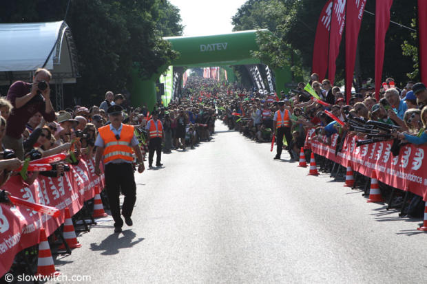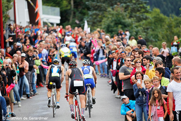 This weekend was the 25th anniversary of the Triathlon de Gerardmer and over 4,600 athletes raced either the Olympic distance event or the XL edition which is a Half. Sylvain Sudrie held off Filip Ospaly and a host of other fast athletes to take the XL win in 4:22:15. Alexandra Louison managed the top spot in the women's XL event and prevented a podium sweep by Team TBB. As you can see by the picture below, the race is also popular with the fans.