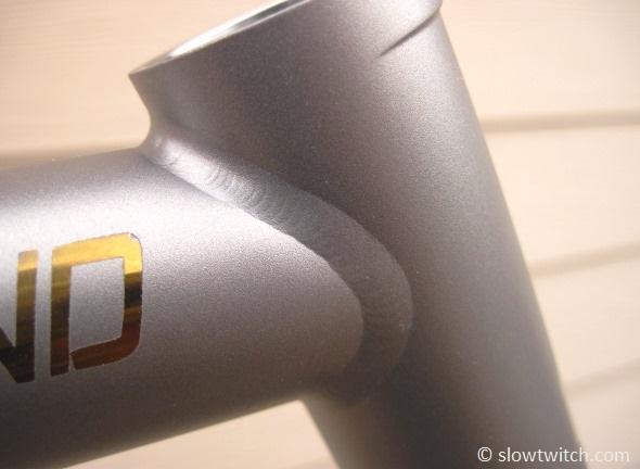 -Undersized seat tube (well under the 34.9mm specification); had to Coke-can-shim the front derailleur clamp