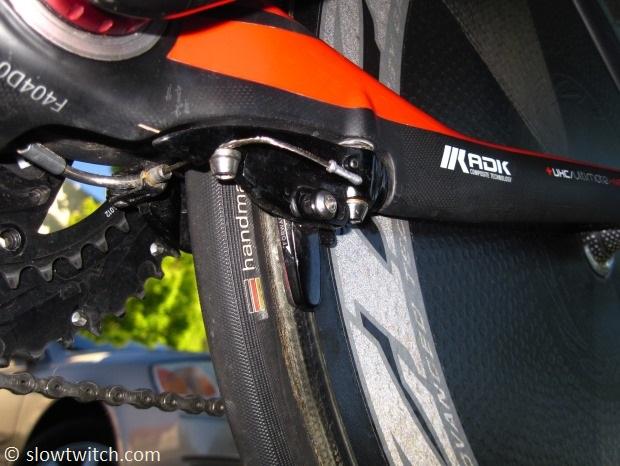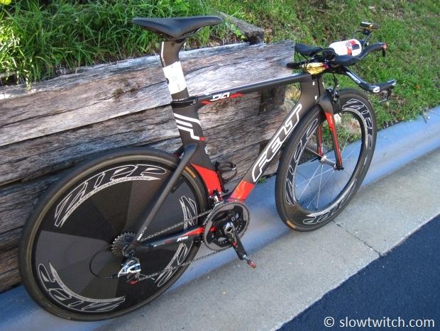 This is the 2013 Felt DA of Minnesota-based David Thompson. David has been sponsored by Felt for several years, and switched to the newest-style DA for this year (he was previously aboard the version that featured a standard rear brake caliper). His other bike equipment sponsors include SRAM, Quarq, Zipp, and Continental. All photos were taken on Saturday, September 21st, 2013 – the evening before Rev3 Branson.