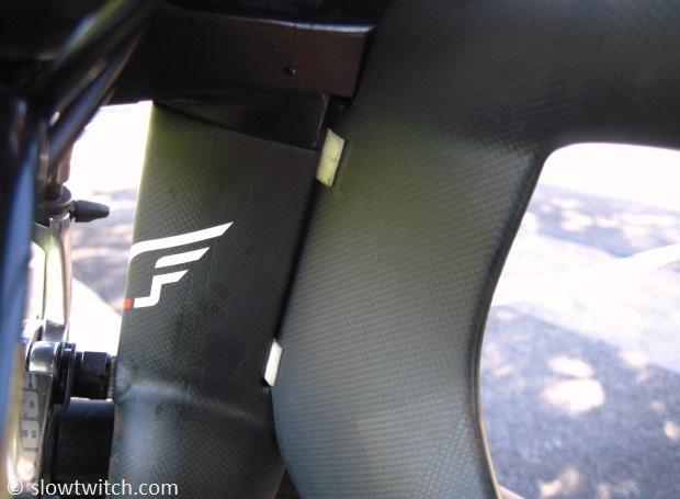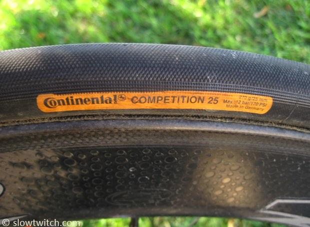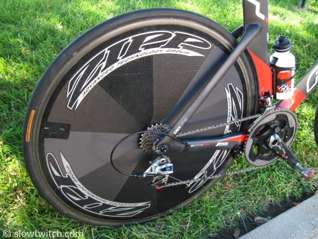 You read correctly – 25mm tires front and rear. Thompson says that he prefers tubular wheels and tires for their light weight, and the 25mm size handles better on tight race courses.