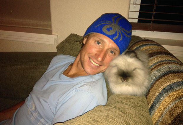 Aussie Pro Chris Legh with Bella. Now Bella isn't really a dog, but since this bunny can bark and clearly also bite, we decided to let Bella in here.