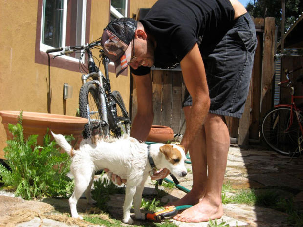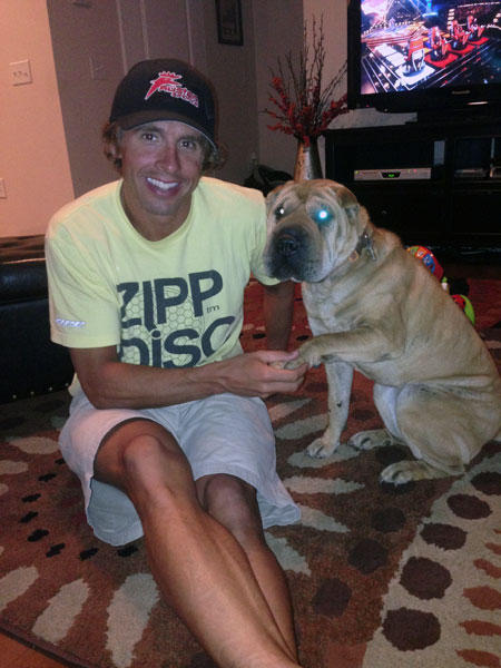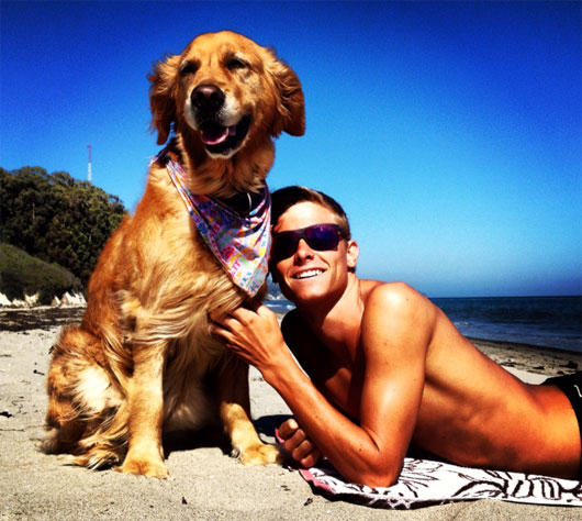 Aussie Pro Chris Legh with Bella. Now Bella isn't really a dog, but since this bunny can bark and clearly also bite, we decided to let Bella in here.