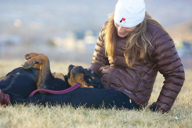 Cyclocross phenom Katie Compton with Pixie, a 3year old rescued tripod Rottweiler. Pixie lost her leg in a car accident when she was 18-month old.
