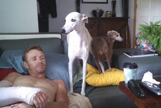 When Richie Cunningham broke his elbow he had caring company from his dogs Sam and Zoe.