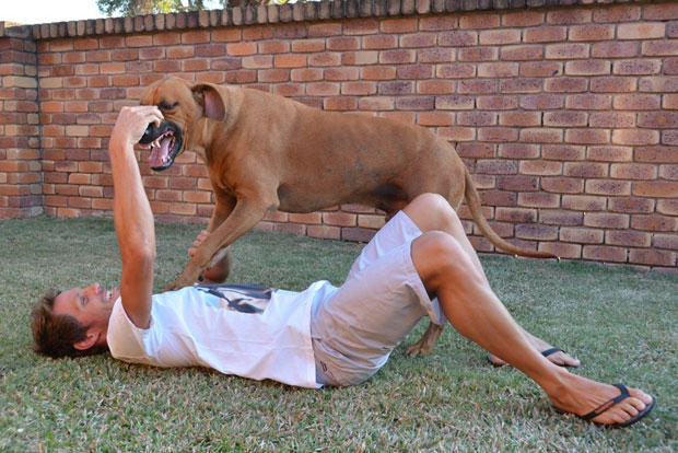 Aussie Pro Courtney Atkinson plays here with Rock, a 5-year old Rhodesian Ridgeback – who weighs 49kg /108lbs. We suspect no one will attempt to break-in and steal a bike or hurt a loved one.