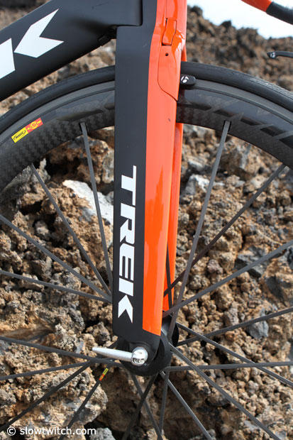 The fork of the Trek Speed Concept with the integrated brakes looks very clean and fast.