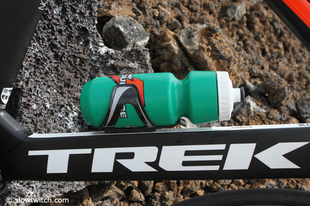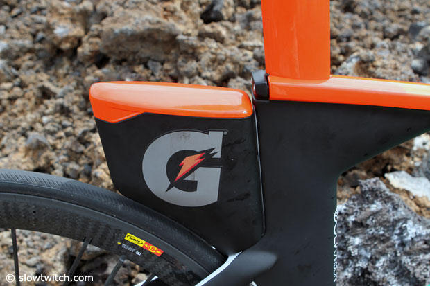 We encountered Aussie Pro Chris Legh on the Queen K highway during 2013 Ironman Kona week and he kindly stopped and let us look closer at his new ride. This new Trek Speed Concept has a stunningly beautiful Gatorade paint job but this reporter sadly managed to scratch the new paint job at the bottom of the downtube.