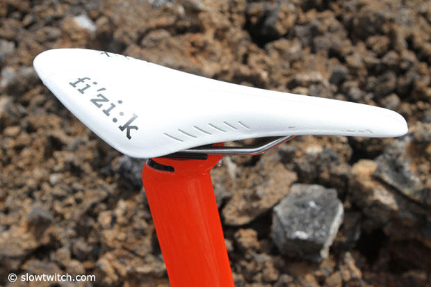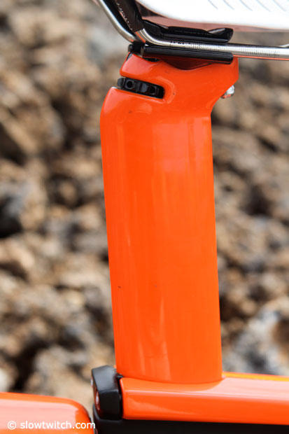 The seatpost features a dial to set the pitch of the saddle.