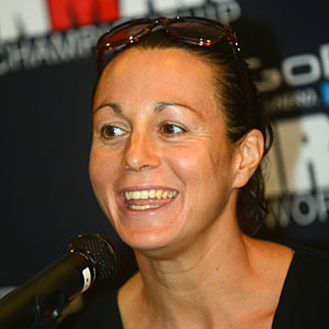 After a brief stop to pose for the paparazzi Mirinda Carfrae was finally able on the way to check-in.