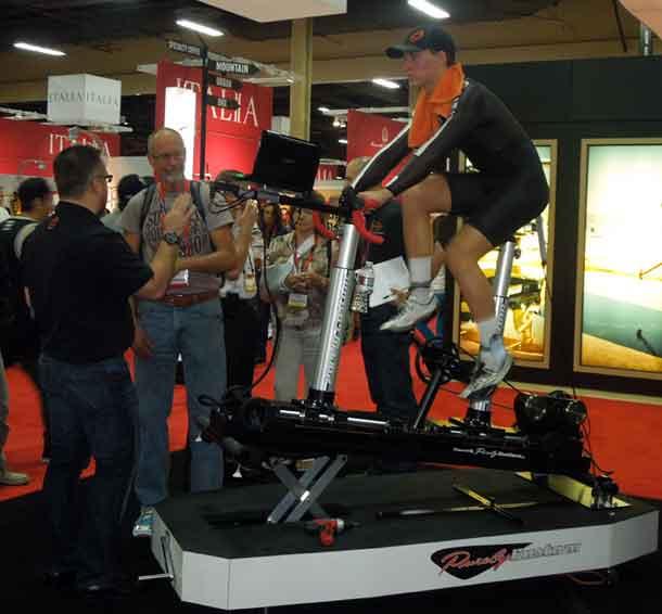 Fifth, the bike will incline, giving the rider the sense of the position while riding up a hill. Some of these bikes listed below do this, some to not (note the pic above, it's the Purely Custom bike on an incline at the Interbike trade show).