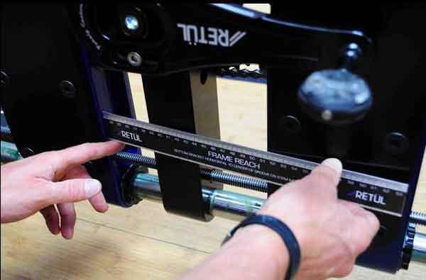 The Muve doesn’t have the metrics printed on the bike. But a ruler (pictured) you hold up to the bike makes stack and reach easy to read from the bike. You can also reconfigure the Muve so that it reads x and y to the handlebar clamp, but I don’t recommend that, because then you have no metrics available in any mechanical or analog way. If you set it up to read x and y to the handlebar clamp (like Guru, Purely Custom and Shimano) the only way you can read the output is to “Zin” the bike, which refers to a way that, using Retul’s motion capture system, you capture and digitize points in space.