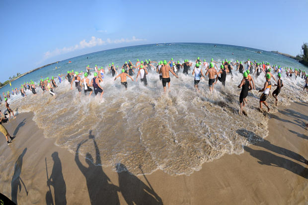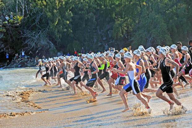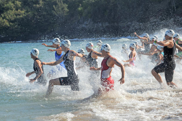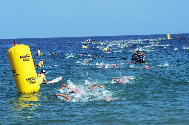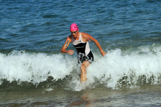 Nicky Samuels chases after women's elite swim leader Flora Duffy. Samuels' 19:50 swim put 1:46 on runner-up Lesley Paterson – a large part of her 2:26 margin of victory.