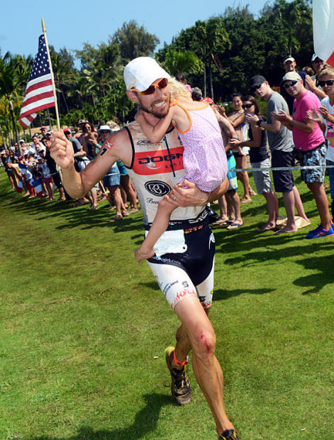 Josiah Middaugh carries a US flag and his 3-year-old daughter down the finish chute,