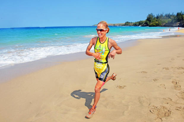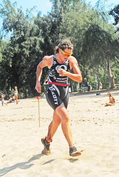 The stalking – Flora Duffy was running 2nd when she ran out of gas on DT Fleming Beach just a quarter mile from the finish line. Lesley Paterson looms ever larger in the rear view mirror.
