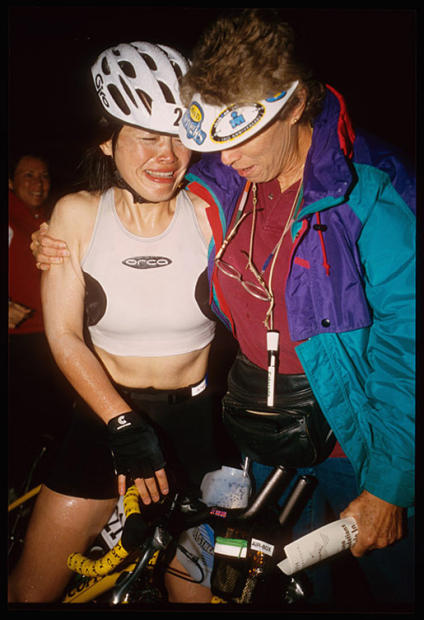 Hiroe Fukushima of Japan won the women’s Ultraman title in 1993. But on the Day 3 double marathon in 2000, she missed the 12 hour cutoff by a minute and a half. Here she is crying from the stress of making the 2000 Day 1 cutoff by two and a half minutes.
