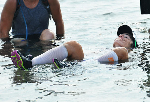 Amber Monforte cools off her legs after winning the race and setting a women’s course record of 24:07:11 in 2010.