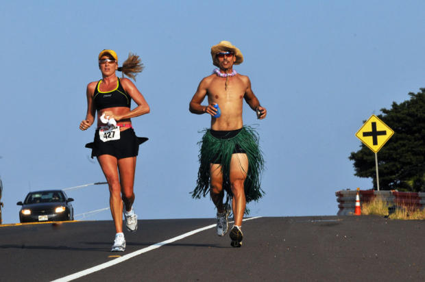 Shanna Armstrong ran to her 4th of 6 Ultraman women's overall victories in 2008. Hula skirted pace runner won style points.