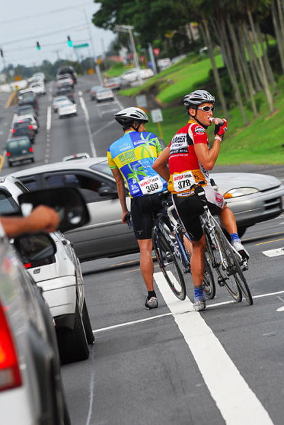 Jeff Landauer and Gary Wang wait for the light to change in Hilo on Day 2 of the 2006 Ultraman.